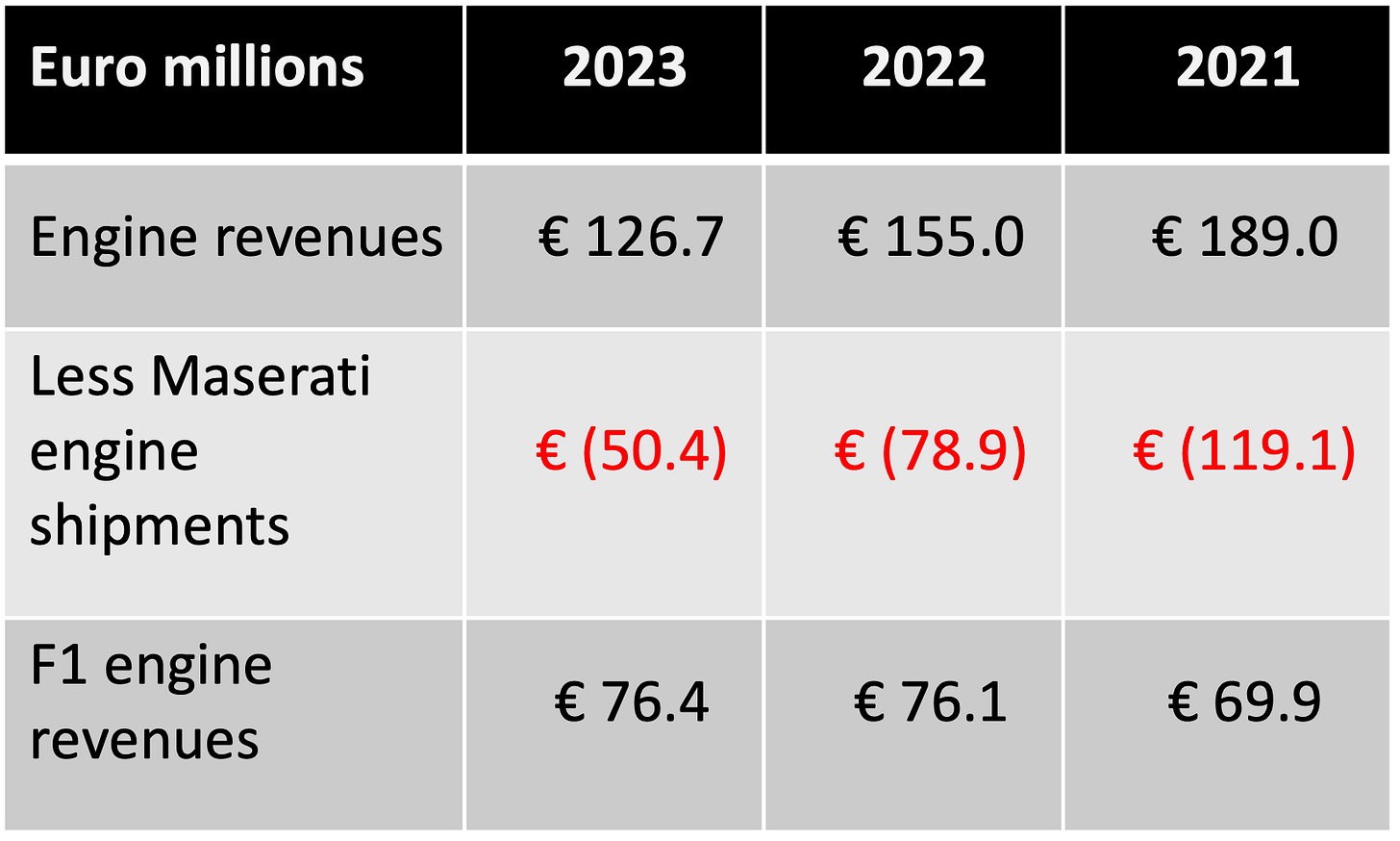 Ferrari separately discloses its engine revenues but doesn’t provide any cost information. The F1 power unit revenues can be estimated as follows: