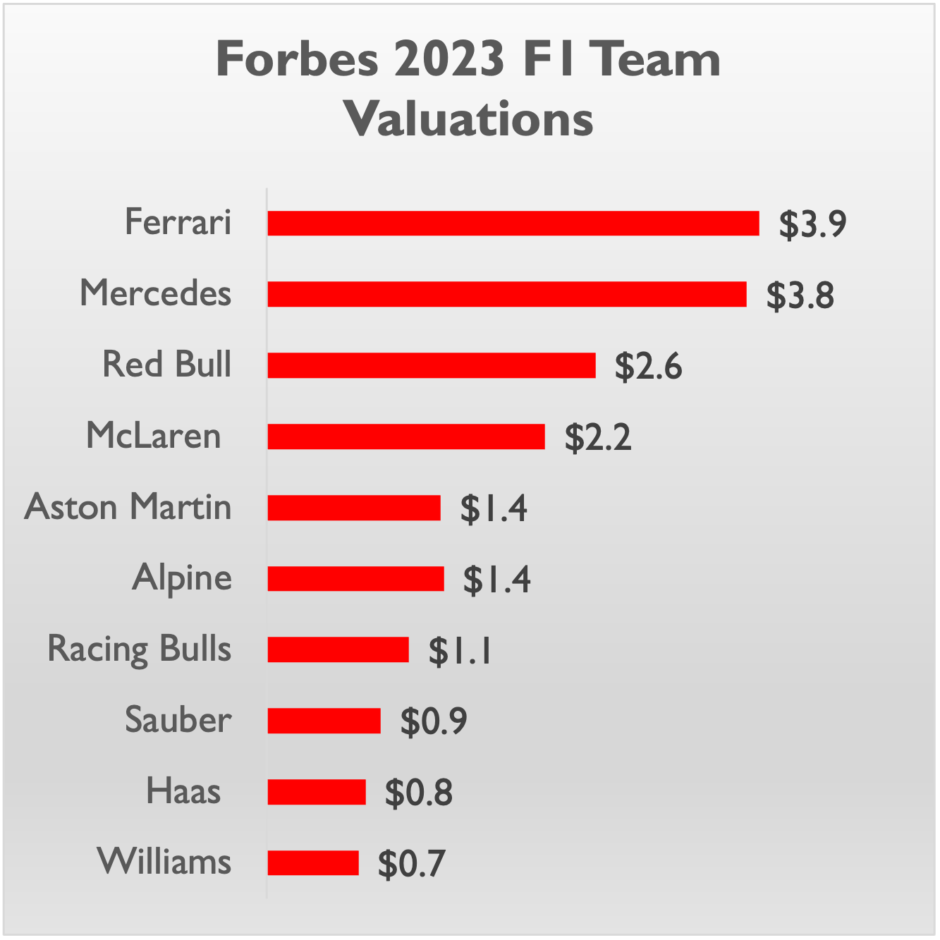 Forbes published valuations for each of the F1 teams in July 2023. At that time 7 of the 10 teams were valued at $1 billion or more.