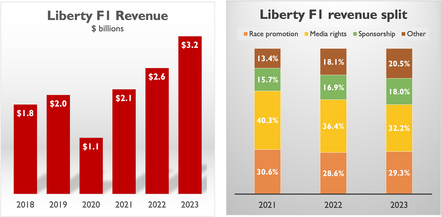 Liberty’s revenue increased 50% between 2021 and 2023, mainly due to the explosion in interest in F1 following the success of “Drive to Survive” on Netflix. In November 2023 the inaugural Las Vegas Grand Prix took place. This is the only race where Liberty acts as the promoter of the event. It was responsible for developing and operating the circuit and the F1 paddock facilities. In return Liberty collected all the revenue from ticket sales and other commercial income which appears in “Race promotion” revenue. Liberty also sells hospitality packages for the Las Vegas race, which appears in “other revenues” above. Lastly Liberty earns revenue from race sponsorships, including the Las Vegas GP title sponsorship sold to Heineken.