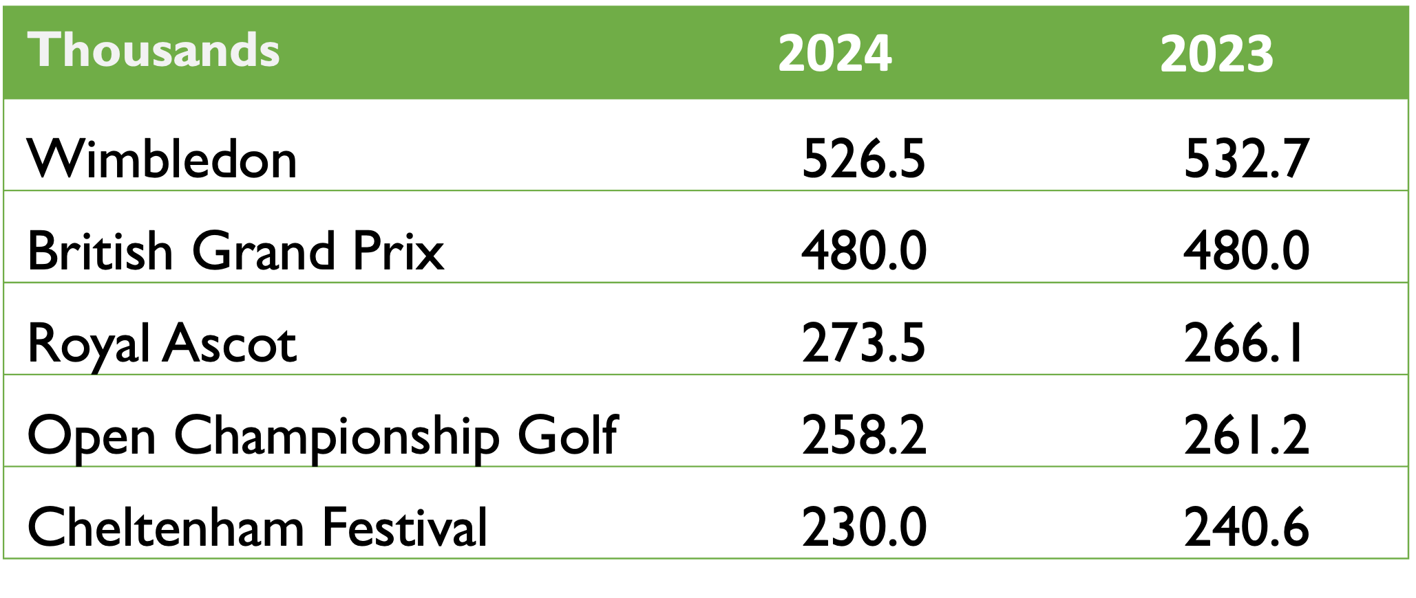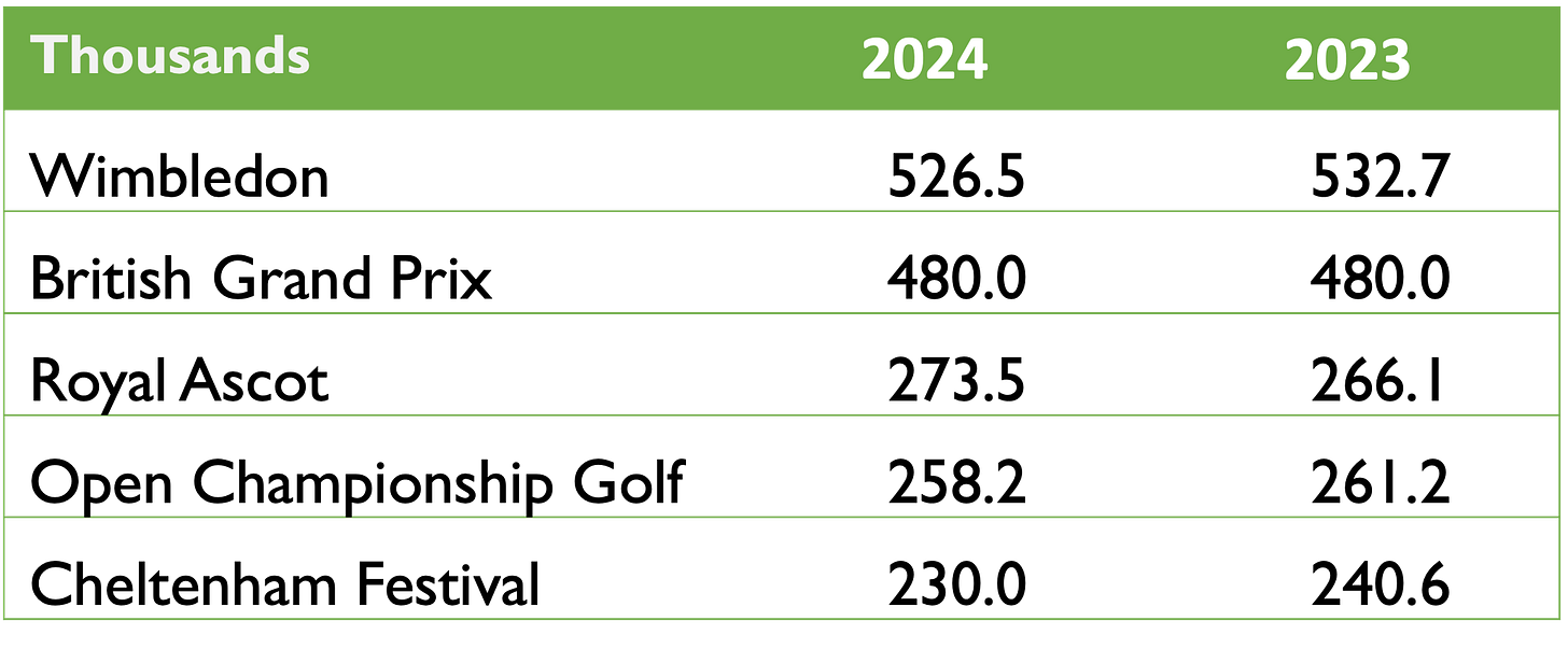 The British Grand Prix makes up over half of Silverstone’s turnover each year. It attracted 480,000 fans in both 2023 and 2024 which makes it the UK’s second largest sporting event behind Wimbledon, which is played over 14 days so the comparison is not entirely fair: