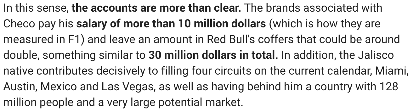 The finances of the Red Bull F1 team in 2025 will affected if it slips to third place in the 2024 Constructor standings since team payments from FOWC will be cut as a result. That makes it difficult to also exit a driver who contributes a net $20 million to the team’s bottom line, assuming Marca’s information is accurate.