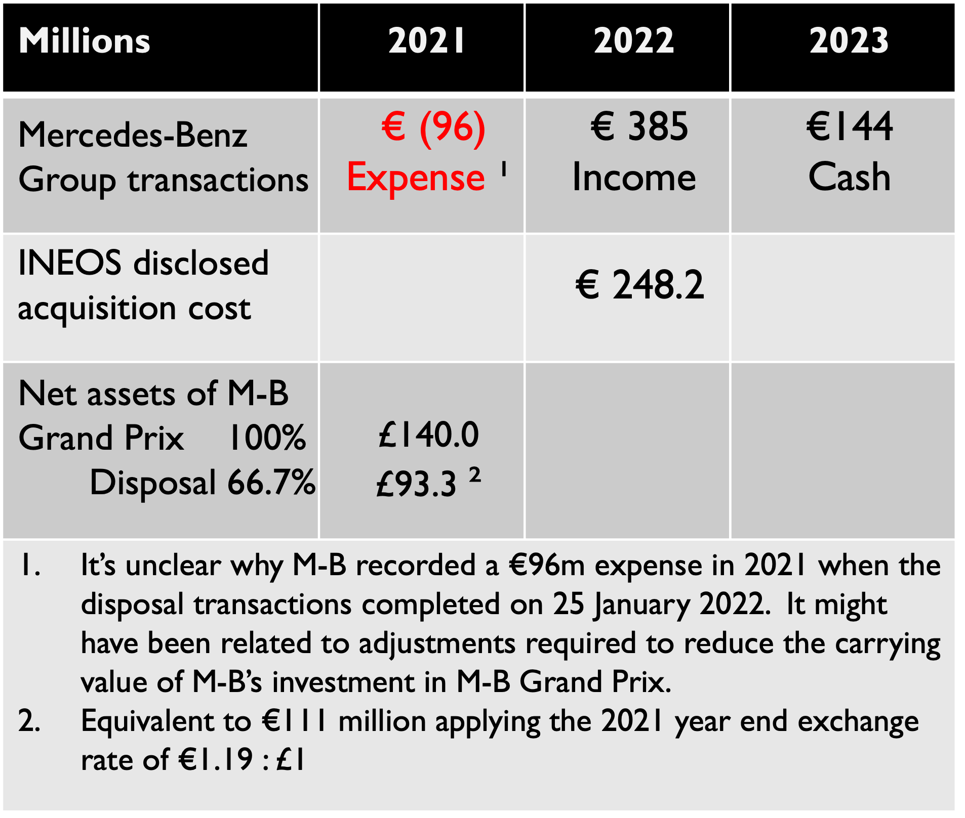 Mercedes recorded a gain of €385 million for the sale of 66.7% of Mercedes-Benz Grand Prix Limited. This gain would have been calculated after deducting the book cost of the 66.7% shareholding M-B sold, i.e. €111 million. That suggests the total consideration was €496 million (€385 plus €111). This ties with the INEOS disclosure that they paid €248 million for their 33.3% stake. Presumably the consideration for Toto’s stake was equal to what INEOS paid since their stakes are equal in size.