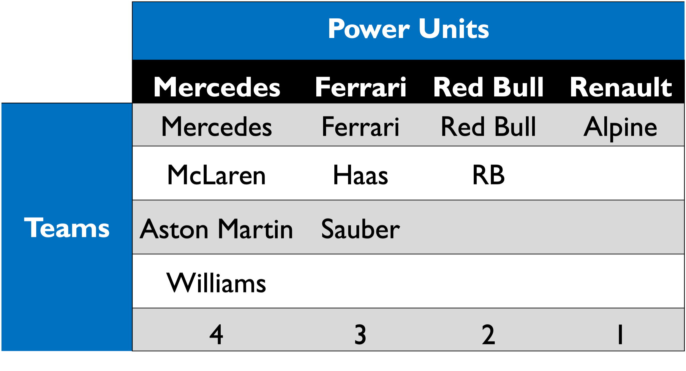 The F1 power unit suppliers since 2021 are:
